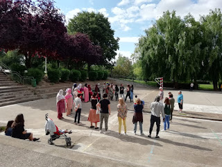 En esta ocasión nuestra Área guió el camino. Una de las profes habló a los presentes (que éramos muchos más) de nuestra Asociación: su creación, funcionamiento, áreas, nuestra enseñanza de español para personas inmigrantes, de nuestras salidas... sin olvidar el papel tan importante que realizamos desde el voluntariado, parte vital de nuestra entidad.